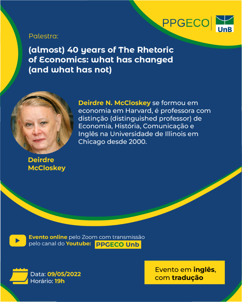 Imperdível! Palestra PPGECO/FACE/UnB com a renomada pesquisadora Deirdre McCloskey, que recentemente se tornou colunista estrangeira na FSP.